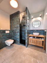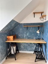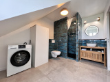 A l'étage une grande chambre parquétée avec un coin bureau et un placard aménagé, un dégagement avec cagibit, une grande salle d'eau avec fenêtre, wc et douche à l'italiènne.